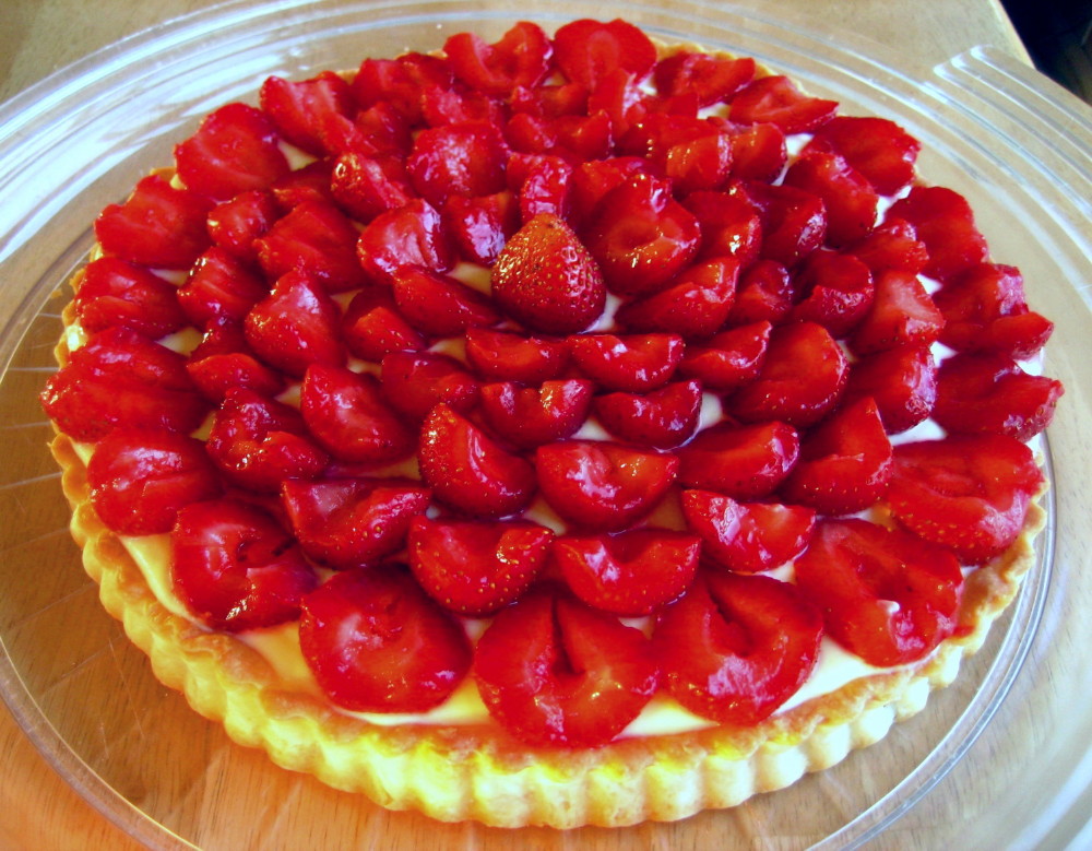 This tart has a cream cheese crust (butter, cream cheese, sugar, flour, and salt) that is mixed, chilled, rolled out, and blind baked. Once the crust is cool, you fill it with a lemon cream that is made by folding whipped cream into lemon curd (lemon zest, lemon juice, sugar, eggs, egg yolks, salt, and butter). The tart is topped with strawberries and chilled before serving.